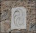 Inscrição Sin texto  Descrição Fragmento de una estela de cabecera semicircular, sin rueda ni molduras visibles, con una luna creciente y dos escuadras unidas aparentemente por la (...)