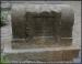 Parte superior de un árula moldurada muy erosionada. El coronamiento consta de frontón triangular con restos de un toro, y un foculus circular |