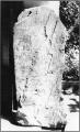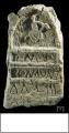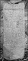 Una gran lastra de piedra en su forma natural, apenas trabajada salvo por la cabecera semicircular. El epitafio se dispone en tres registros; en el (...) |