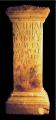 Descripción Ara moldurada bien pulida en sus cuatro caras. En la superficie del coronamiento, con los bordes rebajados para su reutilización y de forma cuadrangular, presente un trisquel en relieve