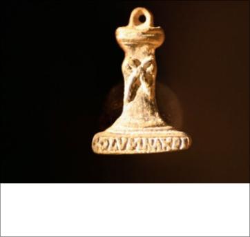 Pequeña pieza en la que se aprecia una figura humana, seguramente de mujer, y una especie de columna con lazo; por debajo de ésta, hay una inscripción
