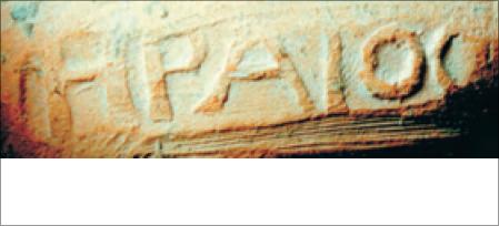 Marca sobre un asa de ánfora, con las letras en relieve, dentro de una cartela rectangular