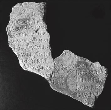 Dos fragmentos que casan entre sí pertenecientes a una placa de mármol rosáceo conchífero, seguramente procedente de la región de Lisboa. El fragmento a), de mayores dimensiones, conserva parte del borde original, debajo del cual hay un margen sin grabar de cerca de 4,8 cm. El texto conservado, que externamente recuerda a los de carácter jurídico, aparece dispuesto en dos columnas, con caracteres de pequeño tamaño. La primera columna tiene diez líneas, la segunda siete