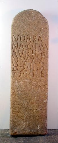Estela de granito fino de forma rectangular rematada en una cabecera redondeada.