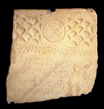 Estela, rota por abajo, de forma paralelepípeda de mármol, que tiene vetas más oscuras en diagonal, una de ellas mayor que atraviesa la piedra desde la parte superior derecha hasta el canto inferior izquierdo. En la parte superior está decorada por un círculo en el medio, con una cruz ancorada en aspa, y a ambos lados una especie de red formada por arcos imbricados. Iniciando la lín. 1 hay grabada una cruz monogramática (símbolo de Cristo).