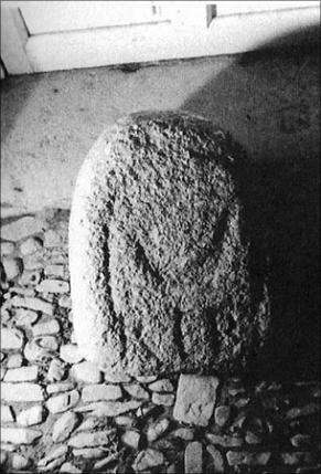 Descrição Fragmento superior de estela de granito con remate semicircular. Arriba tiene un creciente lunar enmarcado por una especie de arco